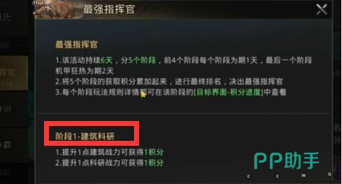最强指挥官活动一个月一次,每次活动举行期间就会持续6天。整个活动就会分成5个不同的环节,第1个就是建筑升级,第2个是巨兽成长,第3个是士兵特训,第4个是资源采集,最后一个是机甲狂热。