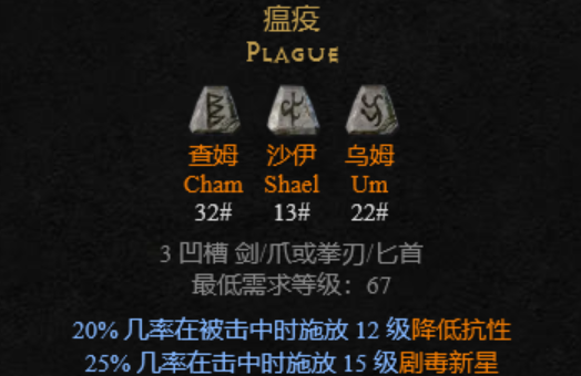 在游戏内也有不少适合刺客和盗贼的装备,例如瘟疫符文,他们分别由查姆、沙伊、乌姆组成,能够镶嵌在剑或者是匕首的插槽上,最低等级要求是67级,能够在被击中时释放剧毒猩猩,对敌人造成毒属性的低buff伤害,在每一次进行伤害之后,玩家都能够再次获得一次抗性的加成,但是这个套装并不适合前中期玩,因为在前期和中期玩家的血量比较低,可能配备了这样的符文之后,会不足以抵抗敌人的攻击。