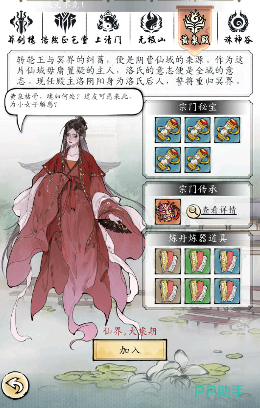 点击查看以后,就能够看到这个门派所拥有的特点,还有它的一些故事背景。其实在门派更换了以后,最大的区别在传承这个方面。仅仅可以有效的提高玩家修炼的速度,而且还有很多跟战斗有关系的一些元素。一种就是在详情介绍里面直接选定以后点击下面的加入。就能够完成门派的切换了,还有一种方法就是在凡界大地图里面。