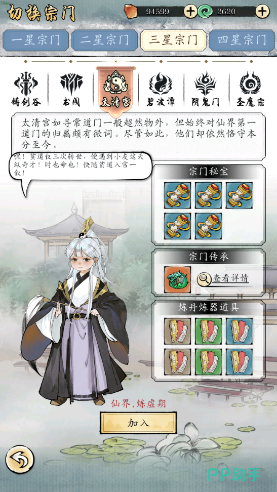 太清宫:到中后期时敌人的伤害会变高,此时三星宗门选太清宫能够让你的坦度提升,因为它的传承可以提供巨额的护盾以及封穴手段,这些都可以让敌人的输出被抵消,加上它本身的秘宝是黄泉秘法,在提升修为上也起到了巨大帮助。