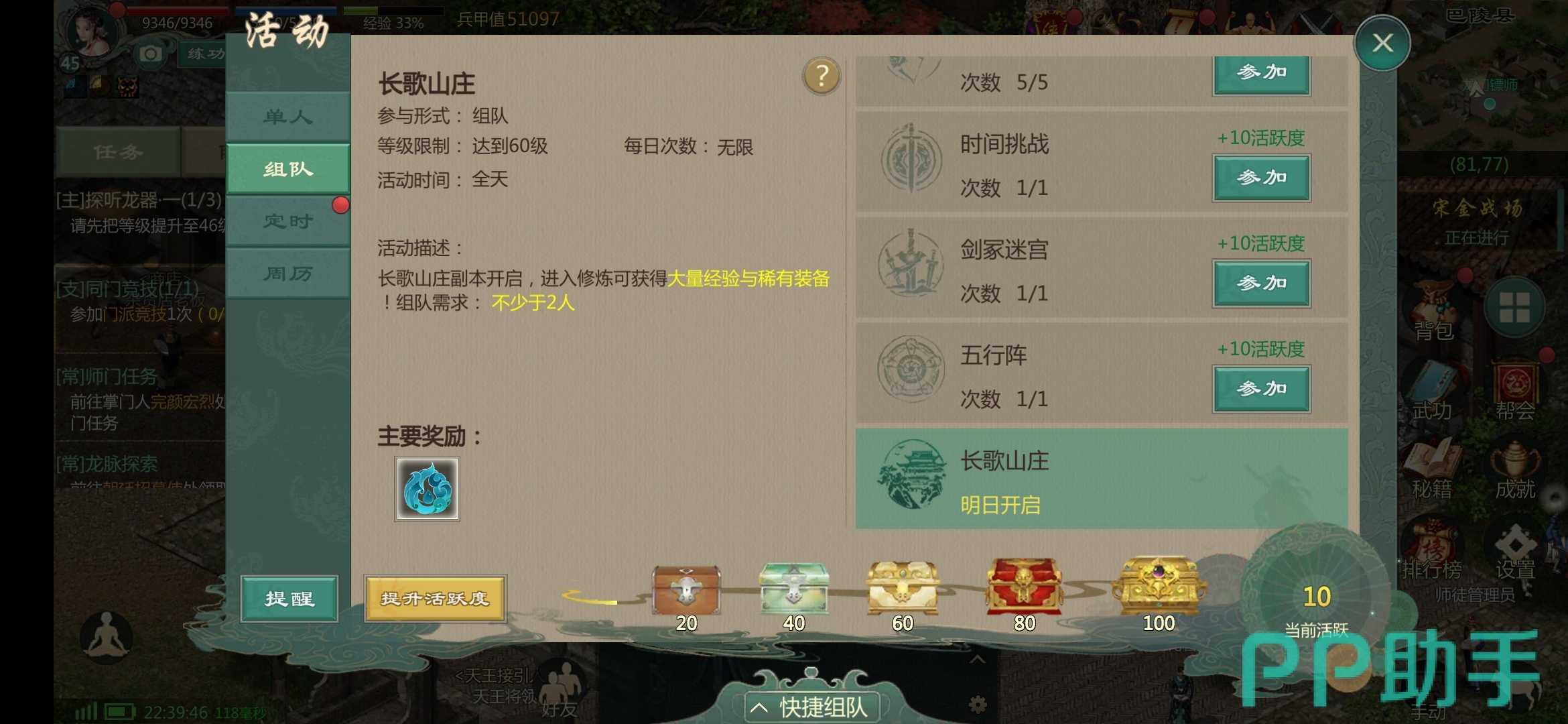 就是每天都可以做的任务,完成后可以获得活跃度奖励,达成一定活跃度可以开启活跃宝箱,达到100活跃后会有50金币。其中又分为单人、组队和定时任务三大部分。
