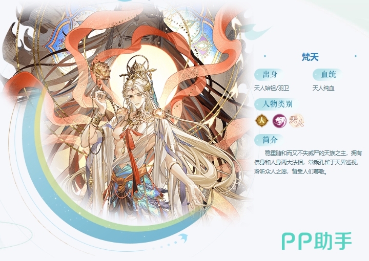 梵天:是一个具有佛性的角色,在外观上面有着敦煌元素的设定,而且在身份上面也是由羽卫出身的,作为一个具有天人血统的角色在游戏中是有很多剧情的,外观设定上面有多种色彩,但是看起来并不杂乱,最精致的是头上带的皇冠以及手上的莲花。