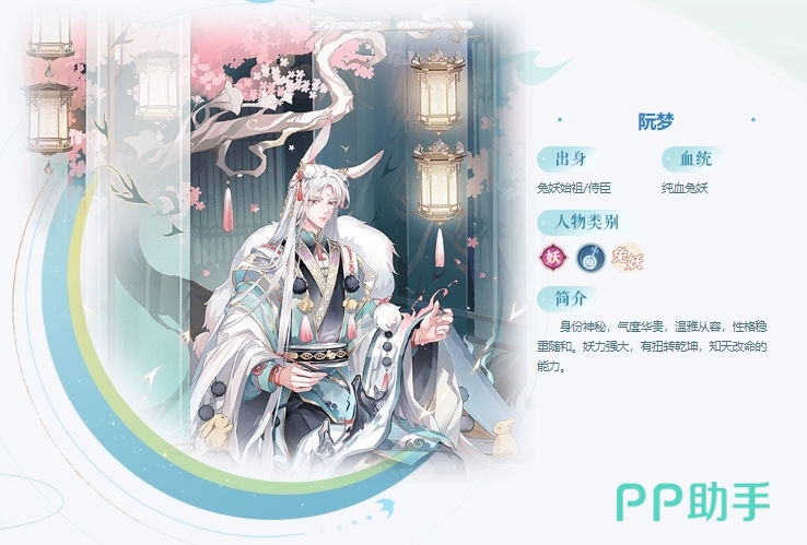 阮梦:看起来是最单纯无害的侍臣,因为在血统上面是兔妖,所以在外形上面非常好辨认,在头上会有两个长长的兔耳朵,而且还透露出来粉色,身上因为血统的原因所以搭配的也是带有兔毛的大氅,在整体的色调上面都展现了温顺的性格。