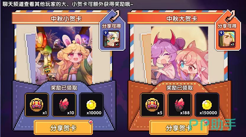 从今天起一直到9月22日游戏内将会上线中秋贺卡活动,分为小贺卡和大贺卡,在活动期间可以自由选择并且领取对应的奖励,还能够将自己的贺卡分享给其他好友,获取分享奖励。节日期间限定返场通过珍藏的扭蛋币开启就有几率获得顶级宠物霜魂守护和小闹福。
