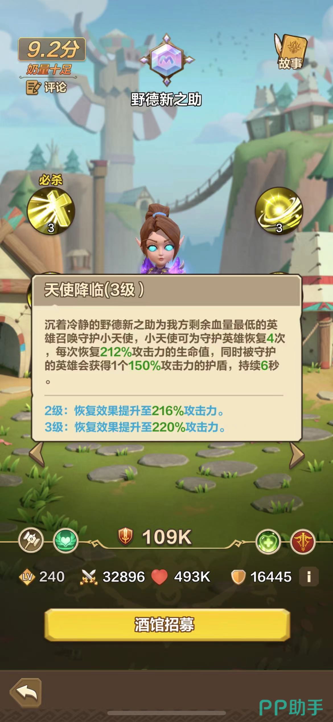 天使降临:会为自己阵营中目前血量最低的英雄进行一个长达六秒的持续回复,每一点五秒会回复该英雄攻击力百分比的血量。