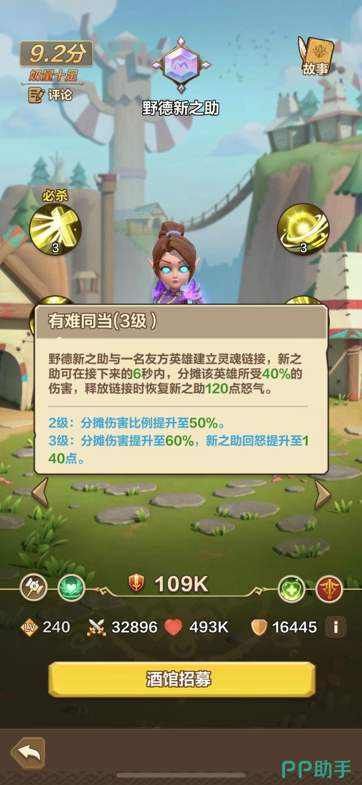 有难同当:是一个辅助类型的技能,野德新之助会选择一个英雄守护对方,在守护期间敌人攻击该角色的伤害会分摊百分之三十给野德新之助,并且在释放这个技能的时候野德新之助也会回复一部分怒气值。