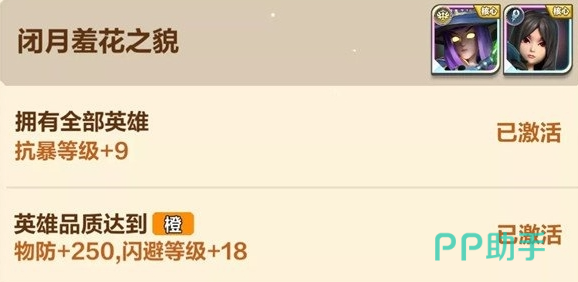 当两名英雄上场,产生效果增加抗暴、橙卡增加闪避、金卡增加法伤减免、生命、物攻、法防、物伤减免。这个阵容增加的属性相比较其他的阵容较高一些。但是这两个英雄比较难以获取,获得的概率小,一般都是保底才能够拿到。不建议普通玩家玩。