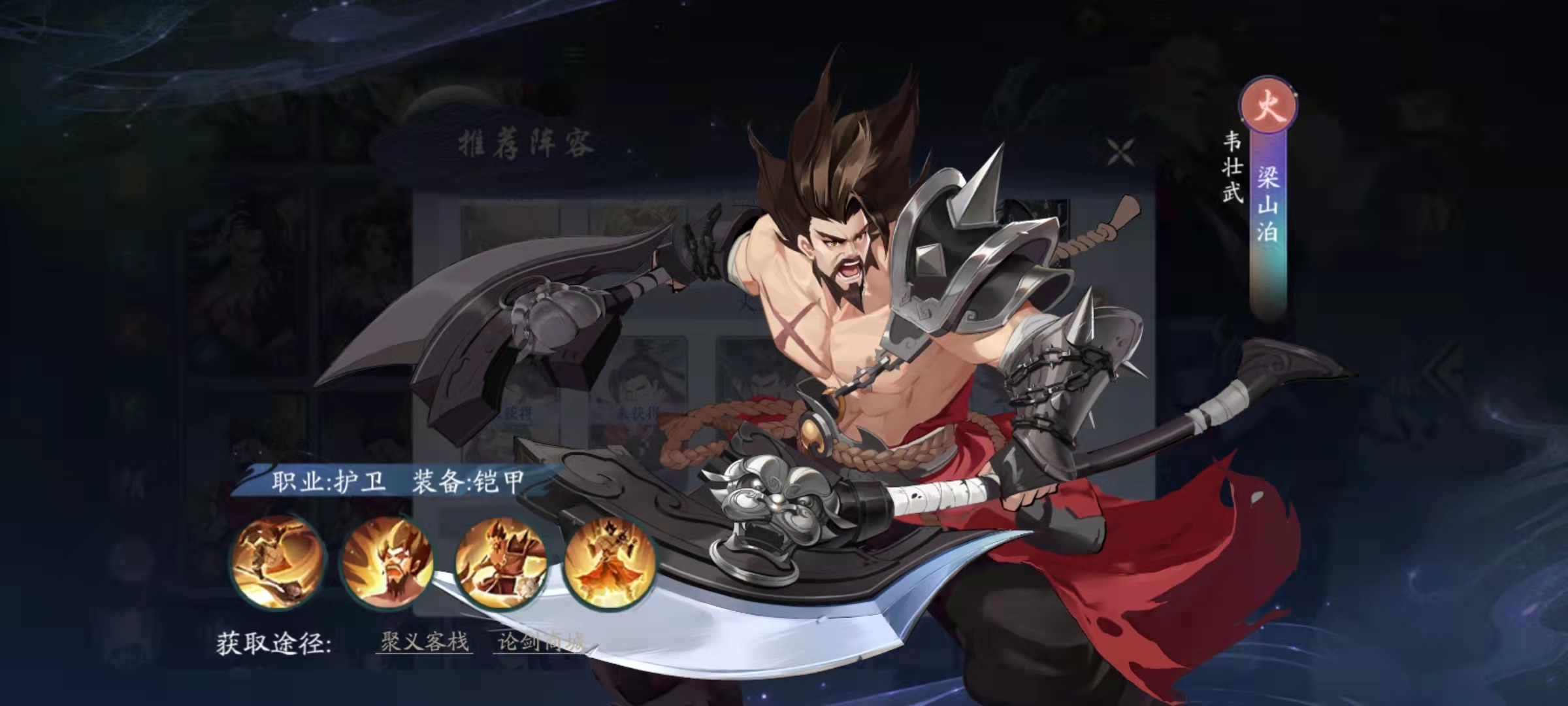 选择火系护卫职业的梁山泊和形意门继续加强裂伤DEBUFF的叠加。梁山泊可以降低敌方的伤害能力,自身还有两条命也是生存能力很强的角色。形意门有范围攻击伤害,普攻强化后命中能回复生命,自身能增加护盾效果,和附加敌方百分比生命值的伤害能力。
