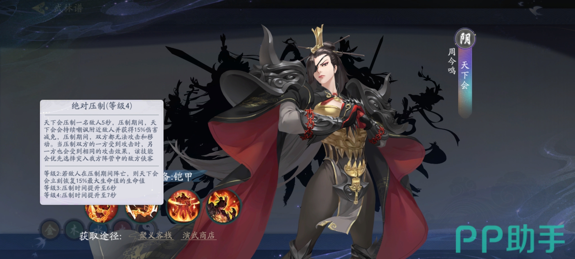 天下会绝技会嘲讽目标,吸引伤害,来保护己方其他角色的安全,但她有常驻的减伤效果和生命加成效果,在受到攻击比较强的情况下会给自己加护盾,保证了生存能力。嘲讽技能在武林闲侠的角色中还是非常少见,有这个技能就奠定了她的地位。