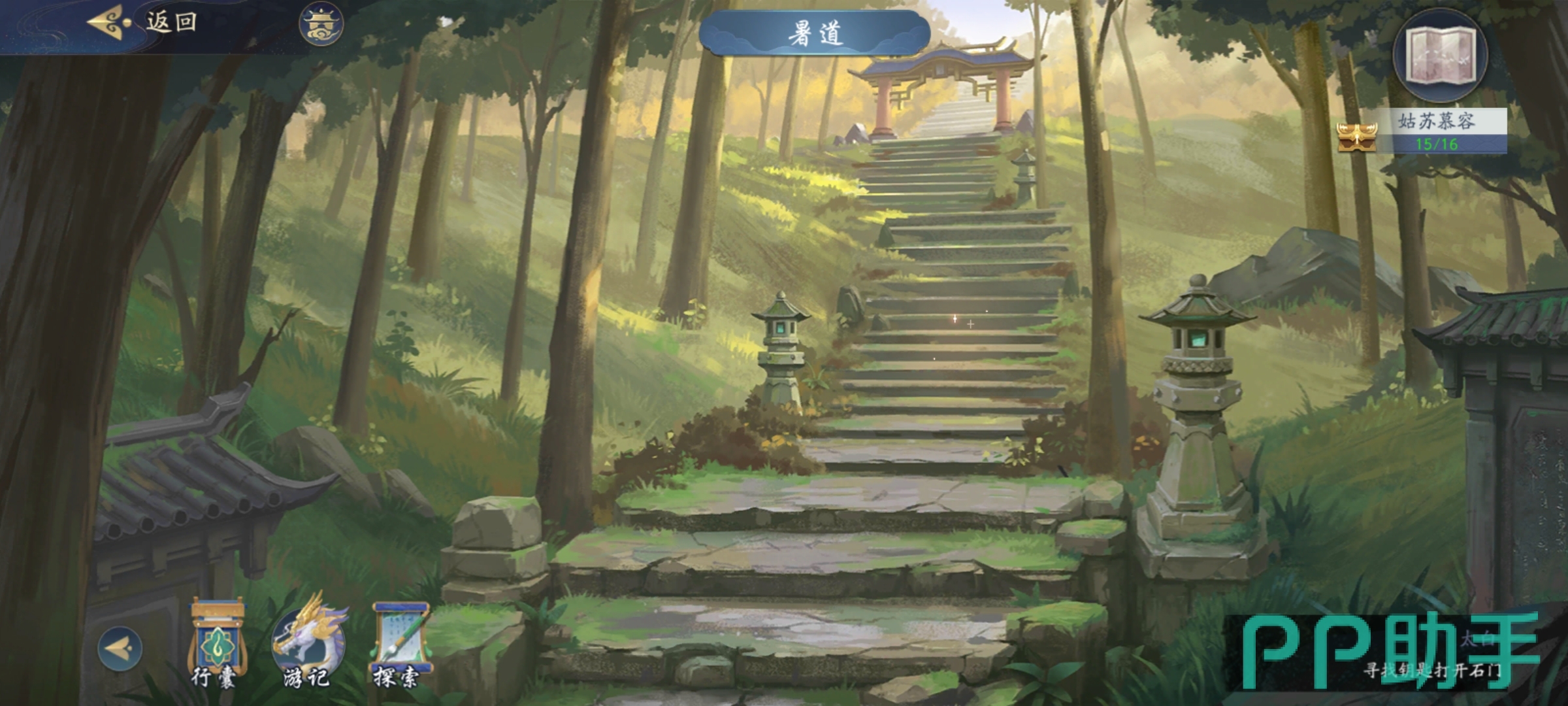 第一把石门钥匙在任务进行到这个阶段直接有提示,找慕容清月对话可以获取到钥匙的线索,提示了李太白的诗句,蜀道,同音就是署道,找到场景中的署道进入点击台阶上的闪光点就可以找到一枚钥匙。