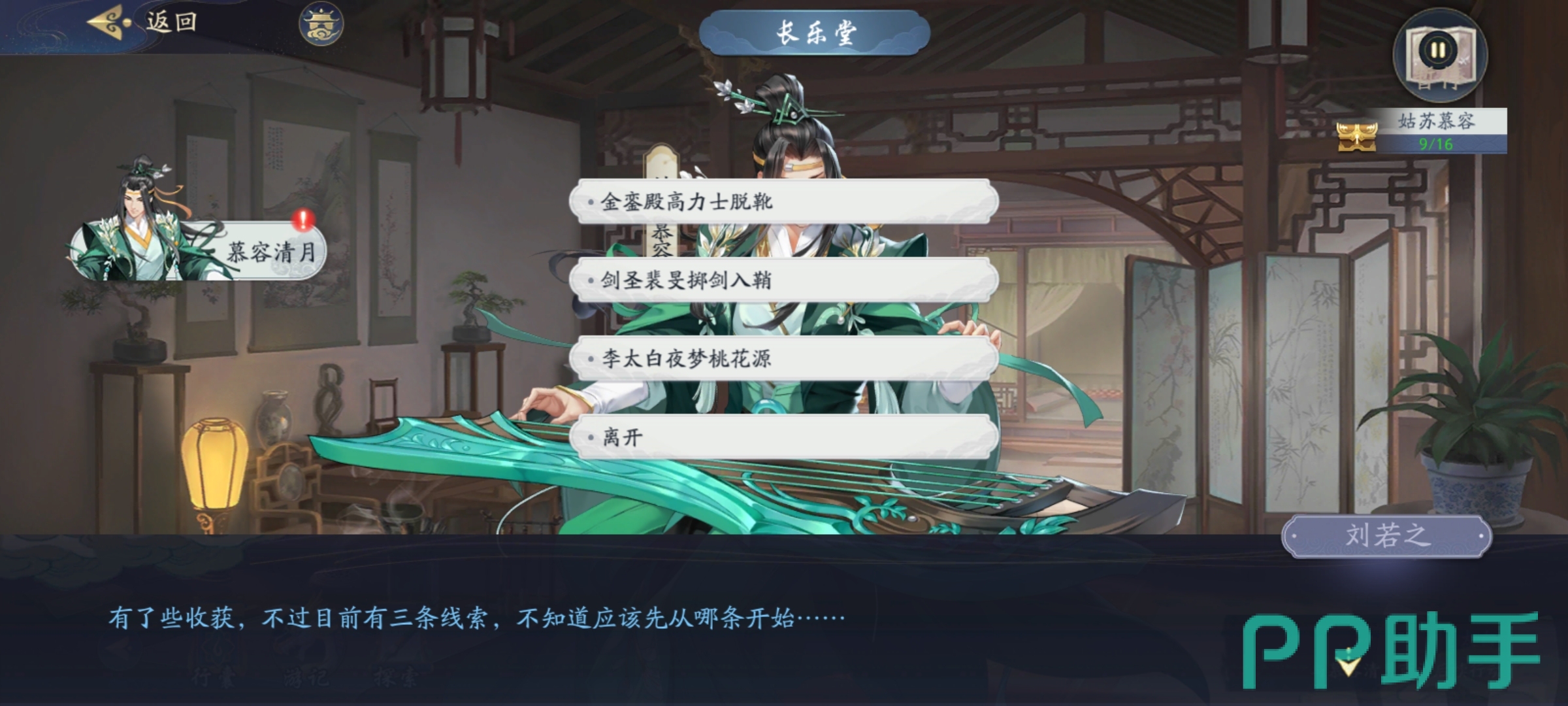 做江湖的探索任务要记住的就是每到新的一张地图,任何一个发光位置都不要错过,很快就能收集齐三条线索,回到长乐堂点慕容清月来选择,正确的选择是剑圣裴旻掷剑入鞘,不过另外两个也可以选择,去每个场景溜达一下,把该拿的奖励都拿了。