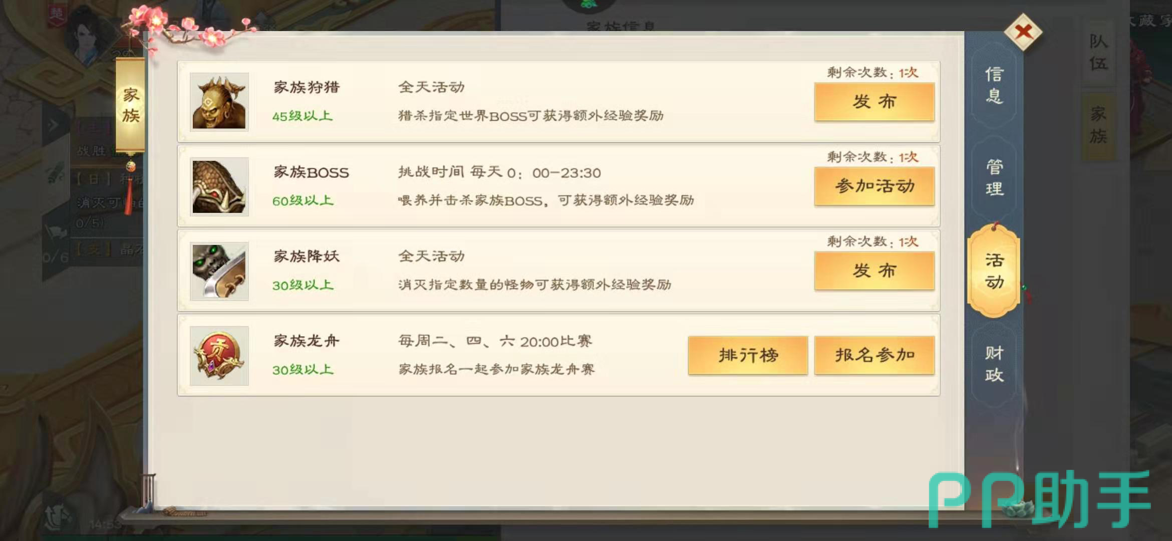 这些活动都是安全收益又高的活动,例如家族BOSS是家族成员一起进行击杀的活动,而且地图不共享,不会出现其他玩家来恶意抢BOSS的情况,可以安心地获得奖励。