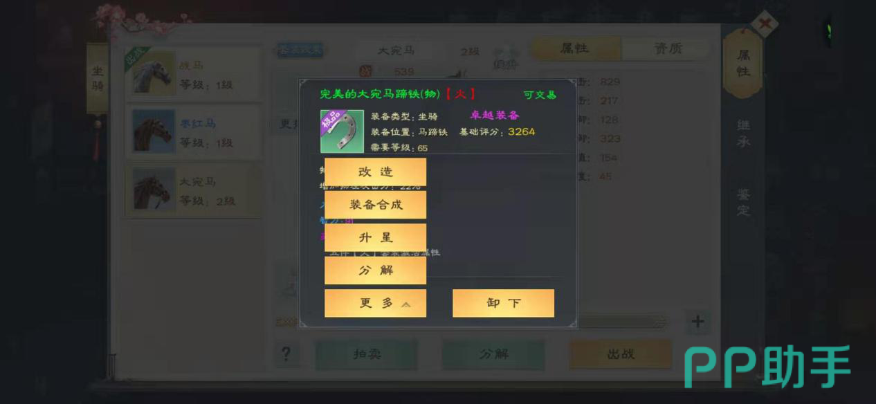 了解了这些之后就可以开始对马匹装备属性进行提升了,提升分为升星、改造两种,其中升星和人物装备升星是完全一样的,这里就不再赘述,重点说一下属性改造。