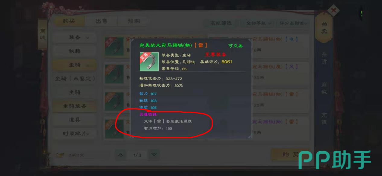 马匹装备的属性同样分为基础属性、附加属性和灵魂锁链套装属性三种,下面小编给大家仔细介绍一下,例如图中所示的完美大宛马蹄铁(物)(火),(物)的意思是该装备属于物理系装备,(火)的意思是灵魂属性是火属性。