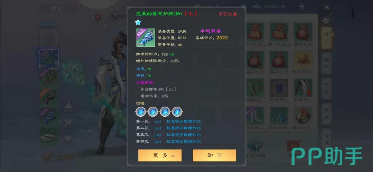 当我们获得一件绿色装备时,有一定的概率出现灵魂属性,如图所示,完美的黄金护腕后面的红色(火)子就代表着这一件装备是具有火魂魄的装备。