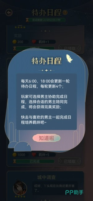 游戏中每天的6:00、18:00都会更新一次待办日程,每次可以更新四个任务,玩家需要选择与事件相对应的男主协助完成任务,在选择对的任务就可以获得大量的好感度,但是选错了虽然会获得奖励,但是奖励就比较少。