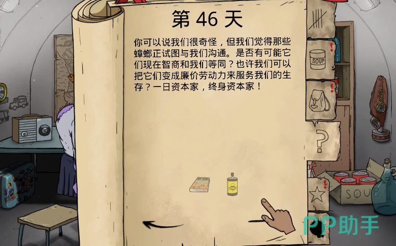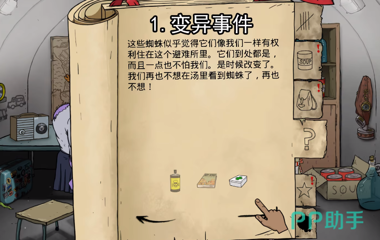 上面两个和蟑螂有关的事件变异几率都比较低,如果想获得比较高的变异几率,那就可以挑战一下游戏里蜘蛛事件,这个变异率会高一些,在场景里会出现蜘蛛,这时候玩家需要使用书本去消灭蜘蛛,在第二天会有90%的几率被蜘蛛咬伤,这时候就可以触发变异,除了蜘蛛之外,在游戏里角色生病也有25%的变异几率,如果角色选择外出探索,那也有10%的几率会变异。