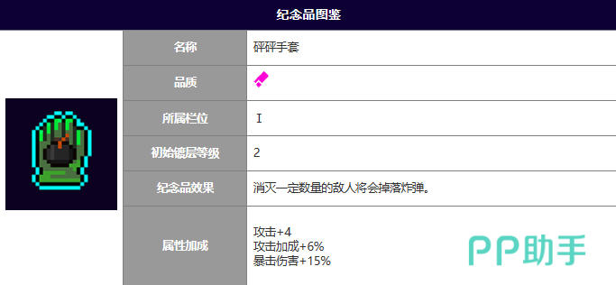 首先在外观上面,砰砰手套是一个绿色的手套,而且手套中间还有一个炸弹,那么可以肯定这个受到的作用肯定是和炸弹相关的,那么通过道具的介绍就能够发现当玩家消灭掉一定数量的敌人以后砰砰手套的作用就是掉落炸弹。所以大家如果在战斗中携带了这个道具的话,那么就不需要在购买炸弹了。