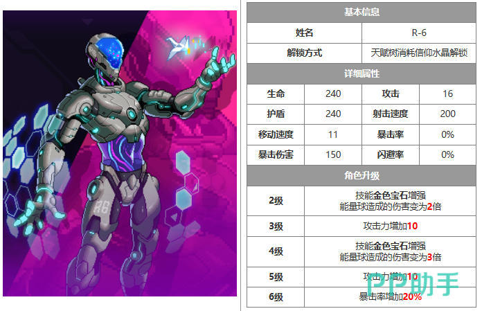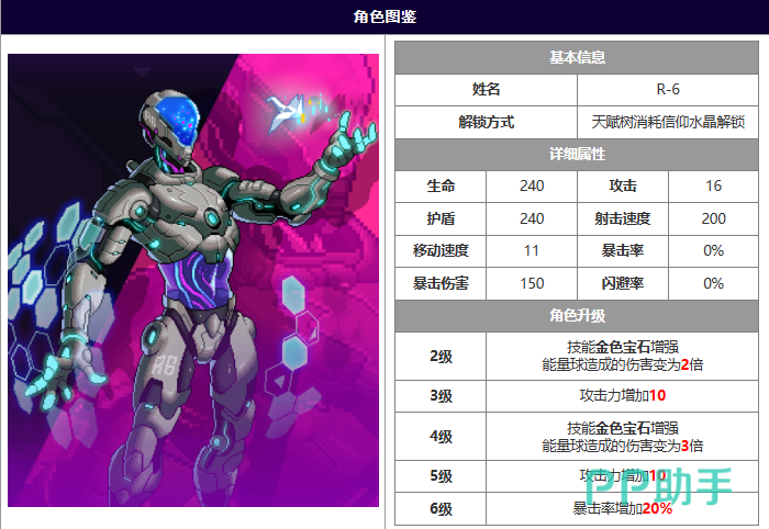 在游戏中r-6作为一名非常具有科技感的机器人,身上都是高科技,所以这名角色的特点也是根据高科技来进行设定的。大家可以看到r-6从上往下看是有着深蓝色的头盔,而头盔上显示着各种高科技,而且还身穿机械战甲,这样在战斗中能够更好的保护自身不受到伤害。