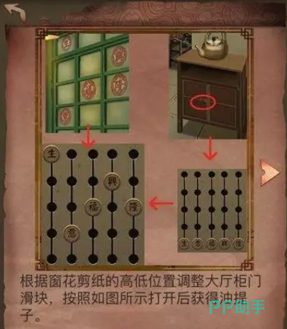 进入后厨以后,仔细找找,可以看到有一挂炮仗,点击调节松紧,即可轻松获得吃火锅必备蘸料之一大蒜,拿到大蒜的诀窍是:紧松松松紧紧松紧紧松,趁着还新鲜赶紧用刀把它剁了,在在厨房里找到装小料的碗乘上蒜泥就算是完成了。在然后就是获取香油之路,这个时候不得不吐槽一下创作者的无厘头了,哪有去火锅店还要自己用油提子找油的,不过这也增加了游戏的趣味性。那如何获得油提子呢?如下图所示,通过玻璃上的窗花提示,在看到生意兴隆几个字,联想到位置,获得密码。