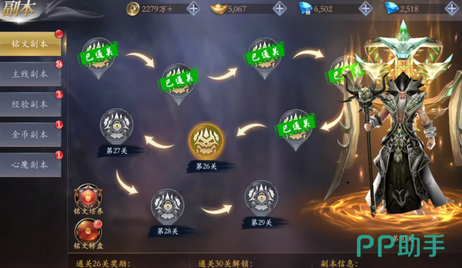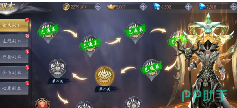 pve模式也就是大家所说的推图模式,在这个模式中我们需要完成不同的任务,通过任务可以获得各种奖励,除了任务以外,还加入了副本玩法,这里的副本给划分成为了铭文副本、主线副本、经验副本、金币副本、心魔副本等不同的类型,每个副本中的内容都是不同的。