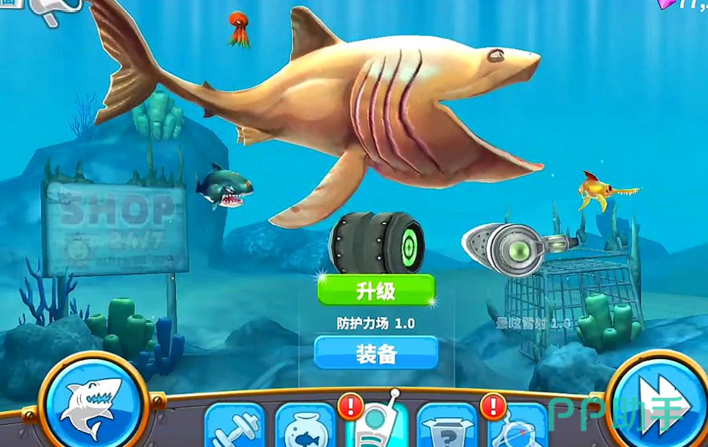 在这款游戏中想要解锁鲨鱼一共有两个办法,首先最简单的是直接购买,你需要先在游戏中购买一定数量的钻石,然后打开商店选中你想要解锁的那一款鲨鱼,点击购买即可解锁。当然如果有不想充值的玩家也是有其他办法的,在游戏中打败敌人可获得积分,只要你的积分足够达到系统的条件,就可以解锁相应的鲨鱼,然后在游戏中直接用金币购买就可以了。