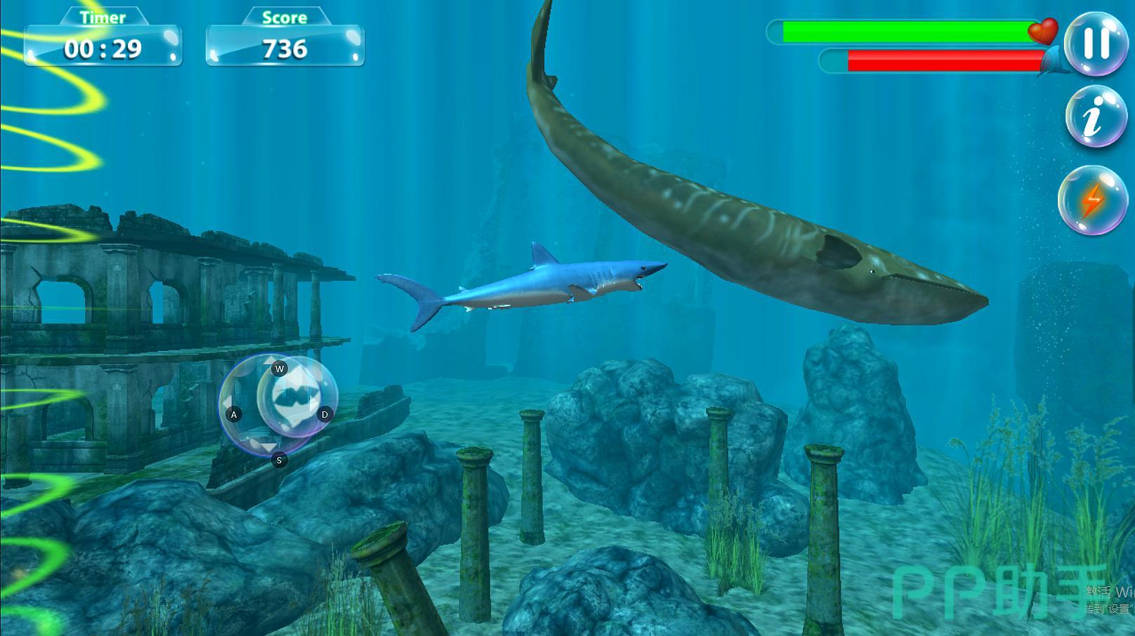 在这里玩家们是一个在海底世界不断进行探索的大白鲨,同时在探索时也会和其他海洋生物进行一个刺激的对抗,同时也要面临一些刺杀。玩家们要寻找食物来维持自己的生存能力,而生存能力是可以通过鲨鱼的饥饿和生命值来进行展现的,只要这两个值变得岌岌可危,那就代表玩家们一定要立马进行猎食来维持生命活力了。