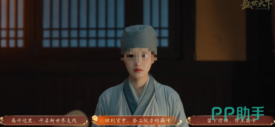 那么还有一个是夺取花簪,除掉刘希,那么在这个绝杀的时刻当中,会有两个选择,第一个是在一柱香燃尽之前没有夺下花簪,那么对应着一对一的结局,还有一种是燃尽前夺下花簪,那么,如果在燃尽前杀掉刘希的话,后续直接选择结束过完所有的剧情,就可以来到新世界线,在这个宫中登上权力的巅峰,那么也会触发后面见到礼治的机会,那么可以选择强行冲出去,让尼姑把簪子送给小子,对应着后续的结局,那么还有一种是大声的呼喊,等这一局关卡完成之后,就正式的进入到了女帝线。