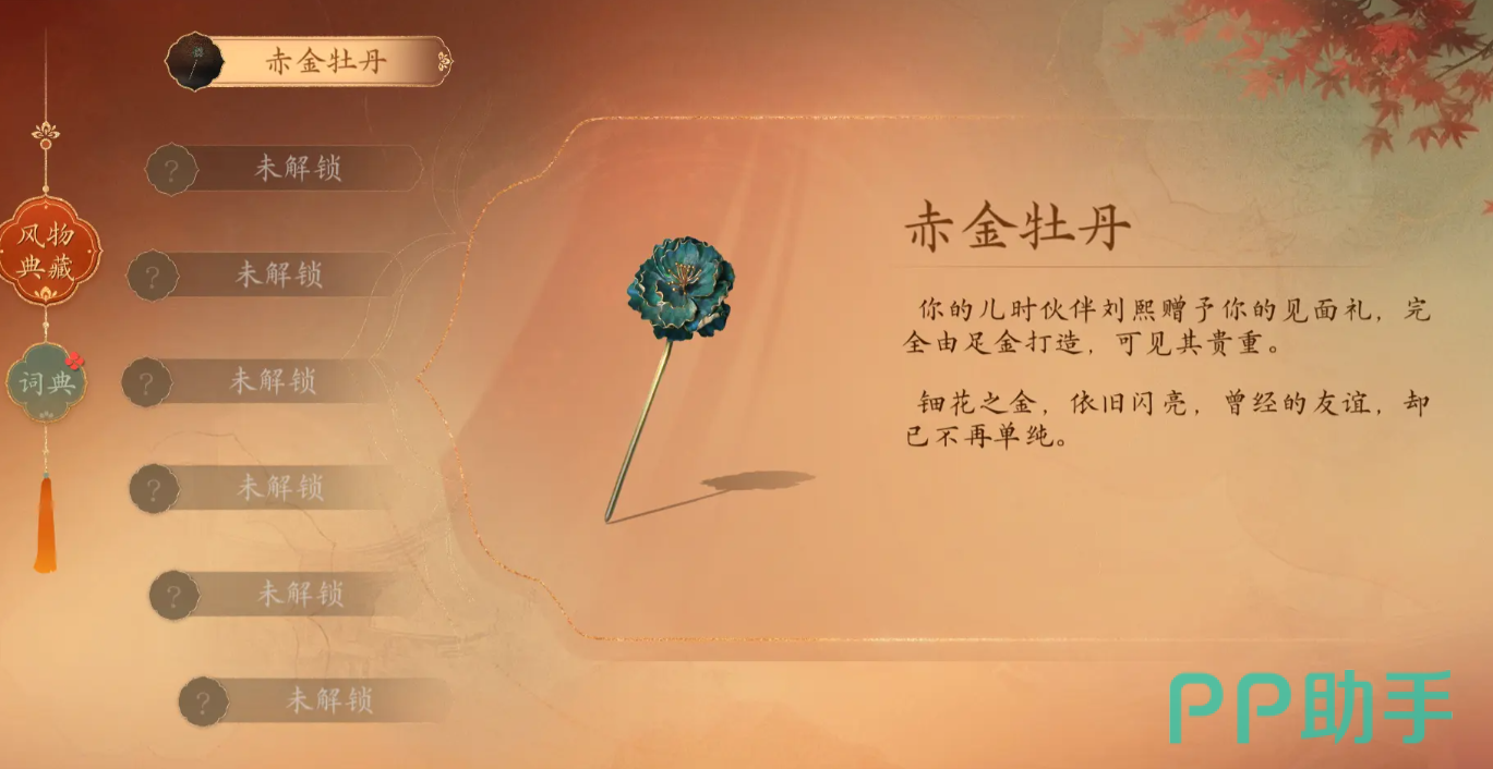 刘熙在游戏当中,是第一个章节就会和玩家相伴的角色,作为儿时伙伴,刘熙在入宫之前,会赠送玩家一枚赤金牡丹,牡丹的簪花金亮,采用足金打造,但同时也代表着刘熙和玩家的友谊不再单纯。