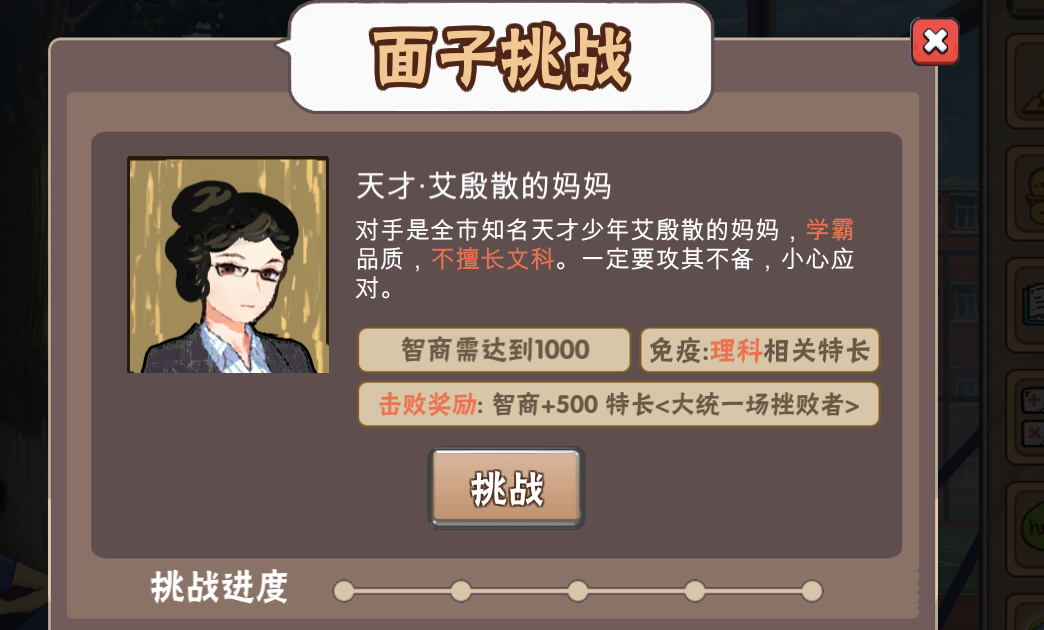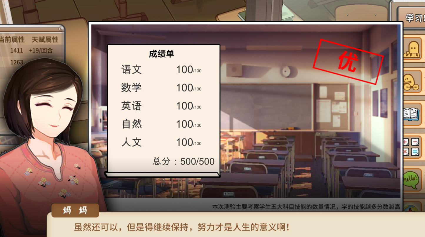 除了这个以外。等级为优的成绩单也会增加父母的面子,但是如果是不及格,面子值则会减少;如果是良,面子值不增不减。