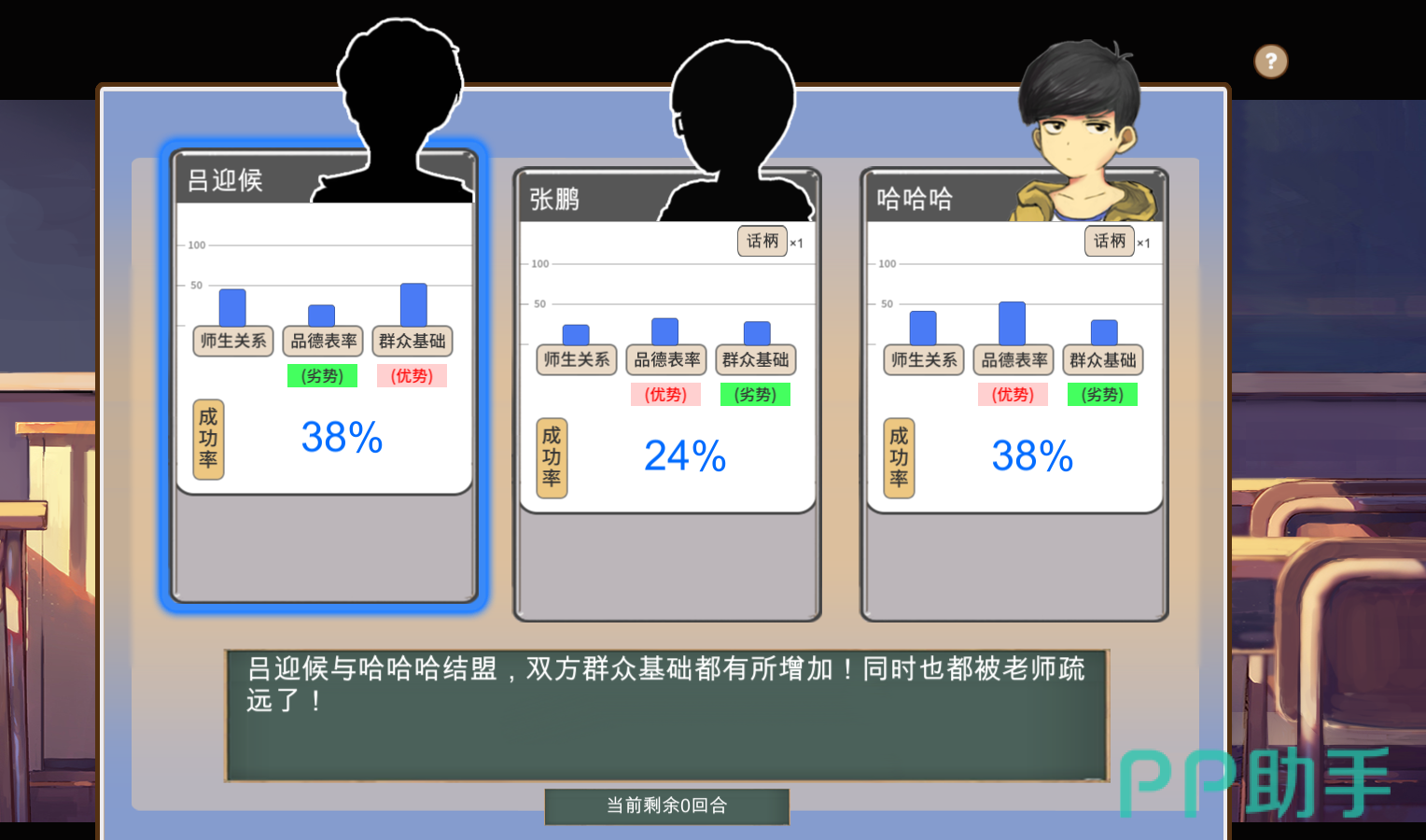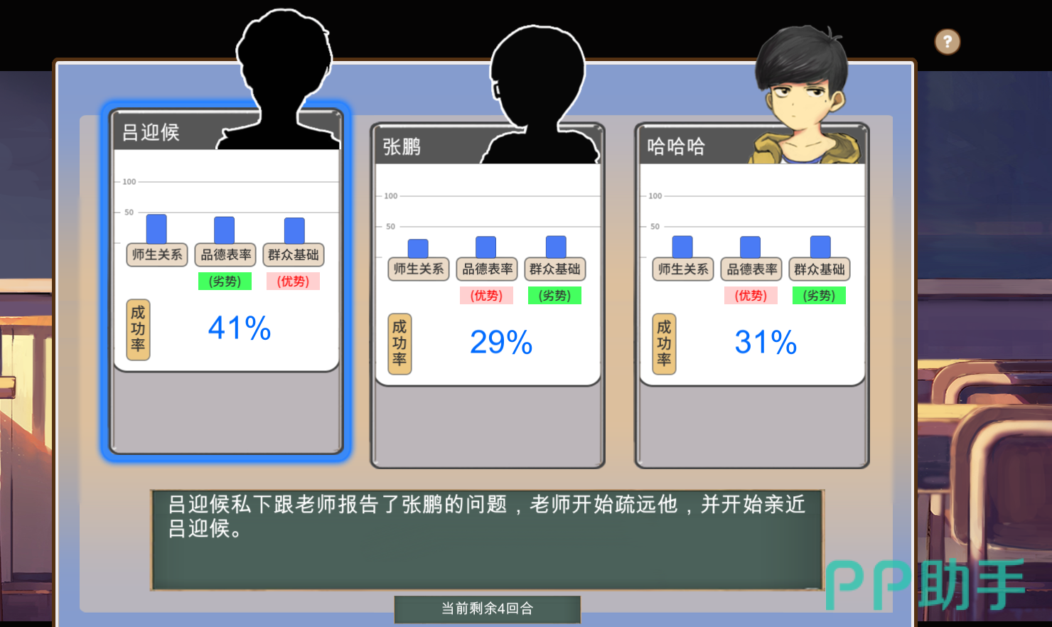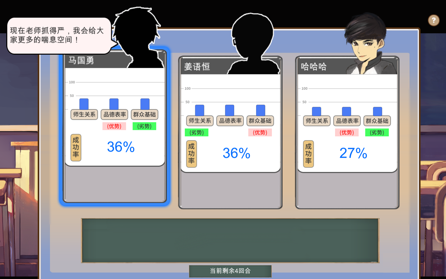 不过大家也不需要着急,通常两个电脑角色都是先自相残杀,我们就坐收渔翁之利。游戏里面的设置比较有趣的是当轮到自己发言,可以拉帮结派,或是拉仇恨,还有几个选项是搞好师生关系、提高群众基础和做好品德表率。