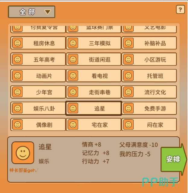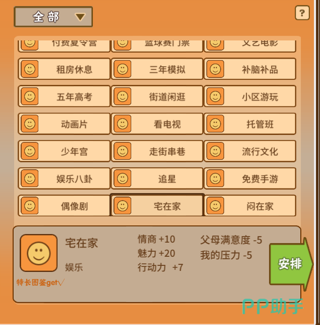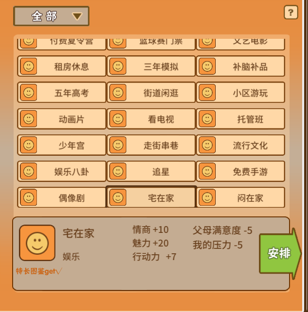 当我们得到了电子琴这个娱乐项目后,就可以进行安排了。要注意的是,特长都是需要通过反复安排才有几率得到。由于电子琴的特长属于传说级别的,因此想要get到这个特长并不是易事。
