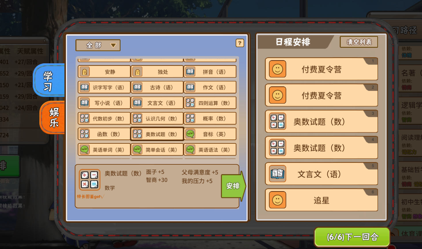 因此想要得到索取的所需东西的另一个条件就是提高面子值。点击安排中学习和娱乐的每一个项目,下面都会显示增加的数值,有一些项目就可以增加父母的面子。