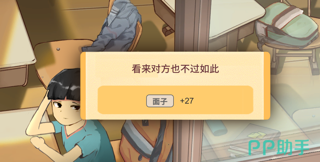等到这个女生对你的好感度增加了以后,游戏也会增加你跟这个女生互动的画面情景,大家要注意观察一下他们的台词。小编就曾注意到一个情景是,男生看到女生跟别的同学一起玩,然后吃醋,感觉自己的魅力不大,那么就是证明男生的魅力值有待提高。