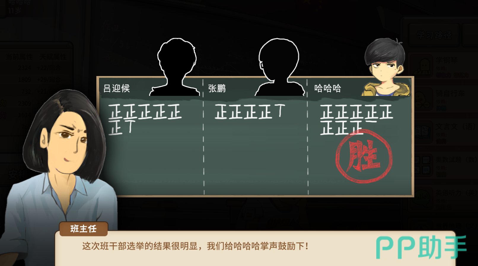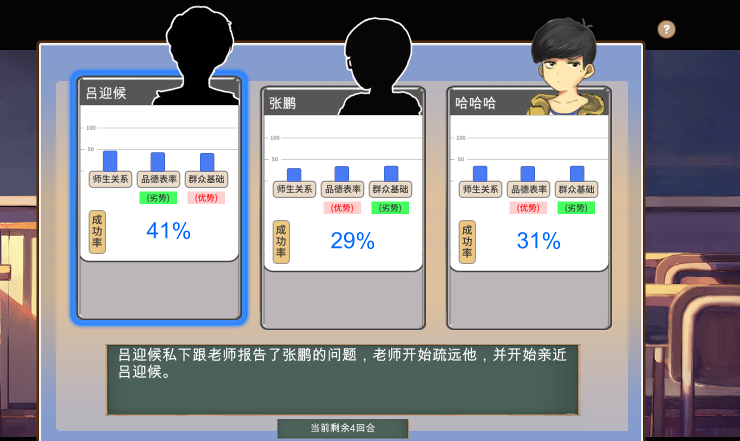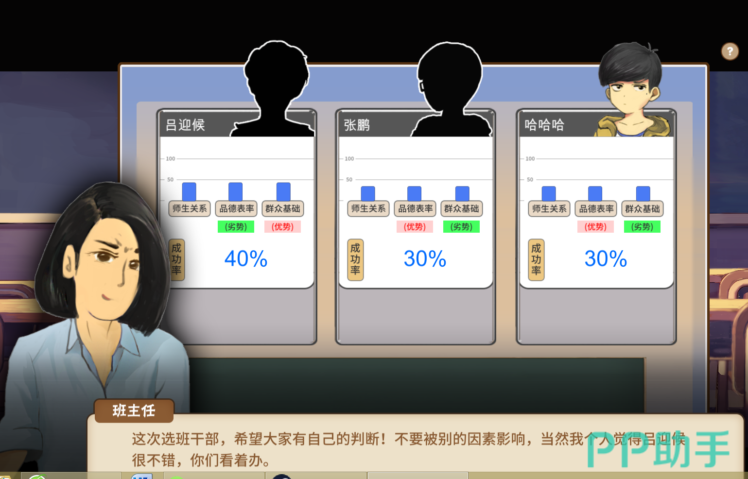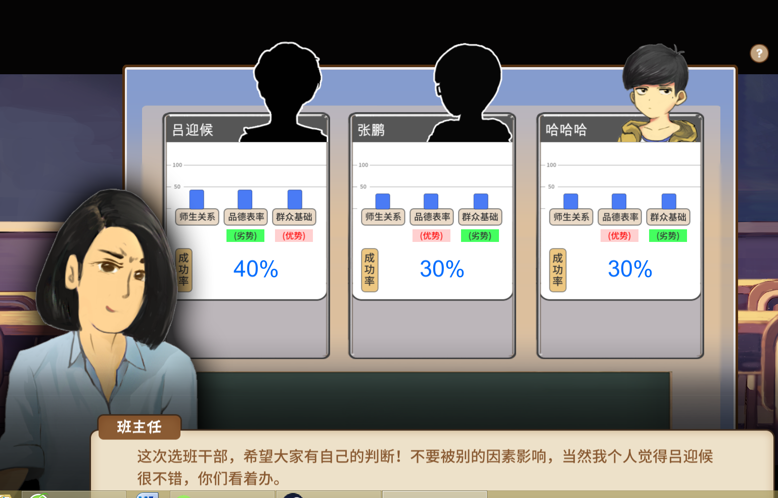 每一场都是三个人进行竞争,另外两个人是电脑。除非你的智力、魅力、情商等属性都特别好,一开始的得票率就是最高的,否则一般来说,每一次竞选的开始。我们都是处于在三个人中的第二,甚至第三,而班主任推荐的也是别的同学。