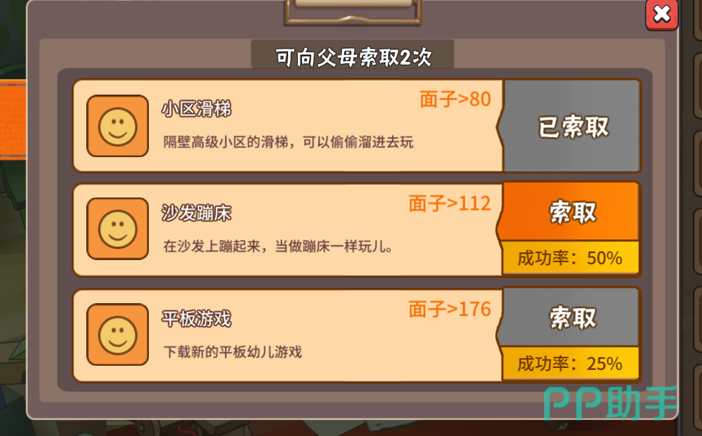 向父母索取之前有一个条件,就是必须要得到索取次数,这个索取次数来源于日常安排,索取次数会随机出现。可以提高父母的满意度,最直接的方法是去商店购买能够提高满意度的商品,比如相框、拖鞋等。