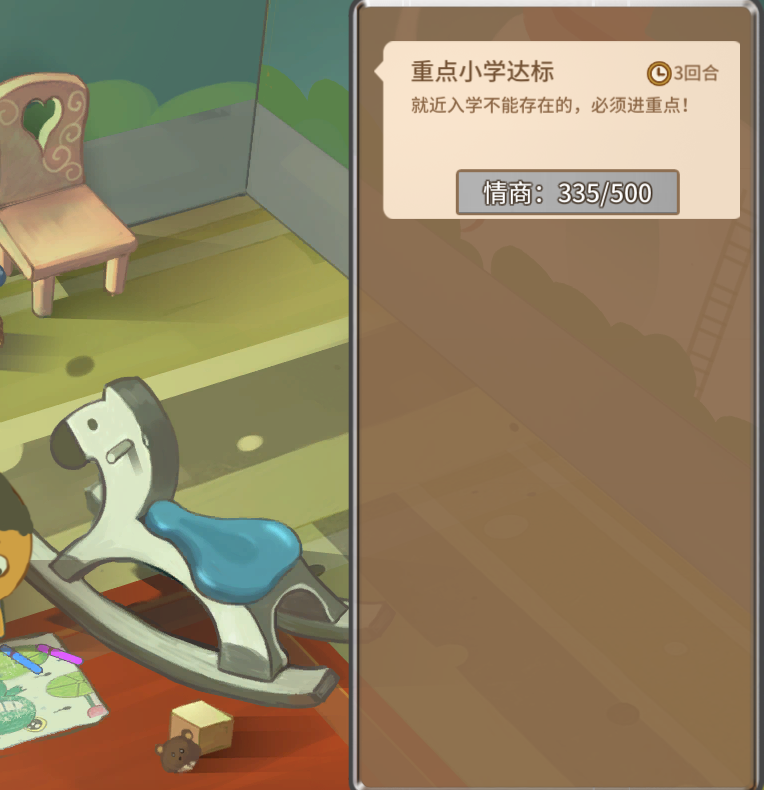 小孩从一岁开始,就要安排不同的课程和娱乐项目给他,每一回安排按钮的下面都会标明距离高考有多少个回合。这种设置的确像一些注重学习的父母,从小就会给孩子立下倒数表。
