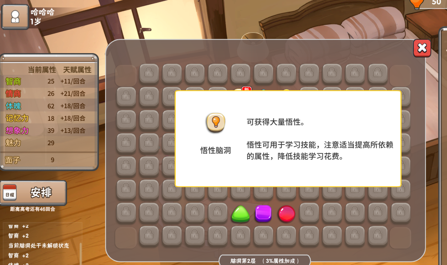 挖脑洞策略: 挖脑洞环节,优先选择悟性点和每回合属性+1的点数,这将带来显著的属性提升。