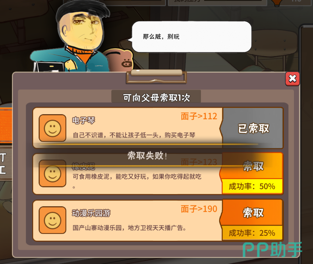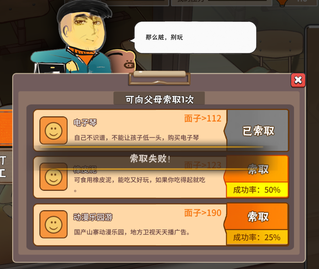 当结果显示为失败后,点击设置回到主菜单,然后再重新进入这一代。你就会发现电脑存档停留在了索取之前,意味着索取次数并没有减少,因此我们又可以重新向父母要东西,直到你成功为止。