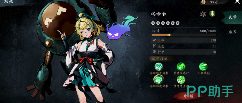 嗒啦啦:普攻是嗒啦啦普通拳,使用普通攻击时,会额外释放3发内力弹,每发内力弹对命中敌人造成5%攻击力的木属性伤害,冷却时间3秒,星星火连打这个技能是在攻击触发暴击时,额外释放3发内力弹,一样是跟上面的普攻一样熟知的木属性伤害,冷却时间也一样,三分拳影这个技能是会把释放内力弹的数量都增加,增加的效果就集中在2排6发的数量,嗒啦啦波动拳这个技能则是强化的效果,且内力弹每次命中敌人时,自身获得1层蓄力效果,只要这个数值满10层之后,使用武器技能就会消耗掉之前积累的所有层数,然后额外释放1发波动拳,对命中敌人造成60%攻击力的木属性伤害。