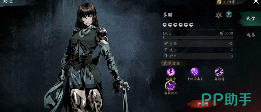 墨瞳:如果大家要组建一个以中毒为核心的阵容就可以用这个角色,她的能力当中的猛毒素就是会将毒素爆发造成的伤害提升50%,千机淬毒矢则是会消耗:30 内力值主动释放9枚毒箭,每发毒箭造成40%攻击力的水属性伤害,并附带1层中毒效果,冷却时间10秒,还有毒影遁的能力,使用闪避可对沿途敌人造成19%攻击力的水属性伤害,冷却3秒,攻击命中被中毒效果影响的敌人时,额外产生毒素爆发效果,造成39%攻击力的水属性范围伤害,并附带1层中毒效果,冷却5秒,最后的毒箭机巧,在攻击触发暴击时会额外发射1枚毒箭,对命中敌人造成26%攻击力的水属性伤害,并附带1层中毒效果。