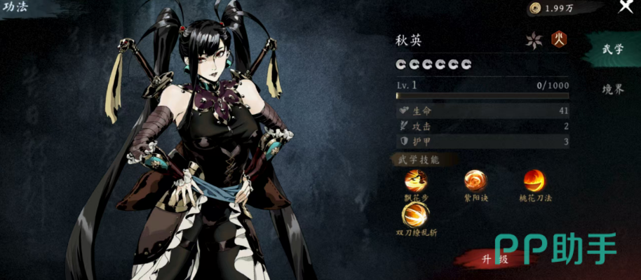 秋英:飘花步这个技能使秋英在使用闪避时,将以自身为中心释放缭乱斩,对命中敌人造成10%*3攻击力的火属性伤害,冷却时间5秒,紫阳诀使用的时候会消耗30 内力值主动向前突进,对沿途敌人造成100%两倍攻击力的火属性伤害,冷却时间10秒,桃花刀法则是在使用普通攻击时,将以自身为中心释放缭乱斩对命中敌人造成10%*3攻击力的火属性伤害,冷却时间5秒,双刀缭乱斩这个技能会将缭乱斩强化为缭乱斩·极,对命中敌人造成10%5倍攻击力的火属性伤害。