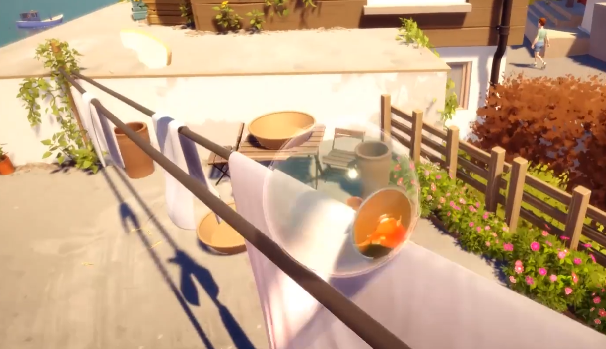 进入阳台以后,依旧是把能过够探索的地方给全都探索一遍,这里只要注意交互就行了,从两个比较大的电线中游过去以后,在前面有一个台子,玩家需要移动到台子上面,顺着台子大家就能跳到大海里面。