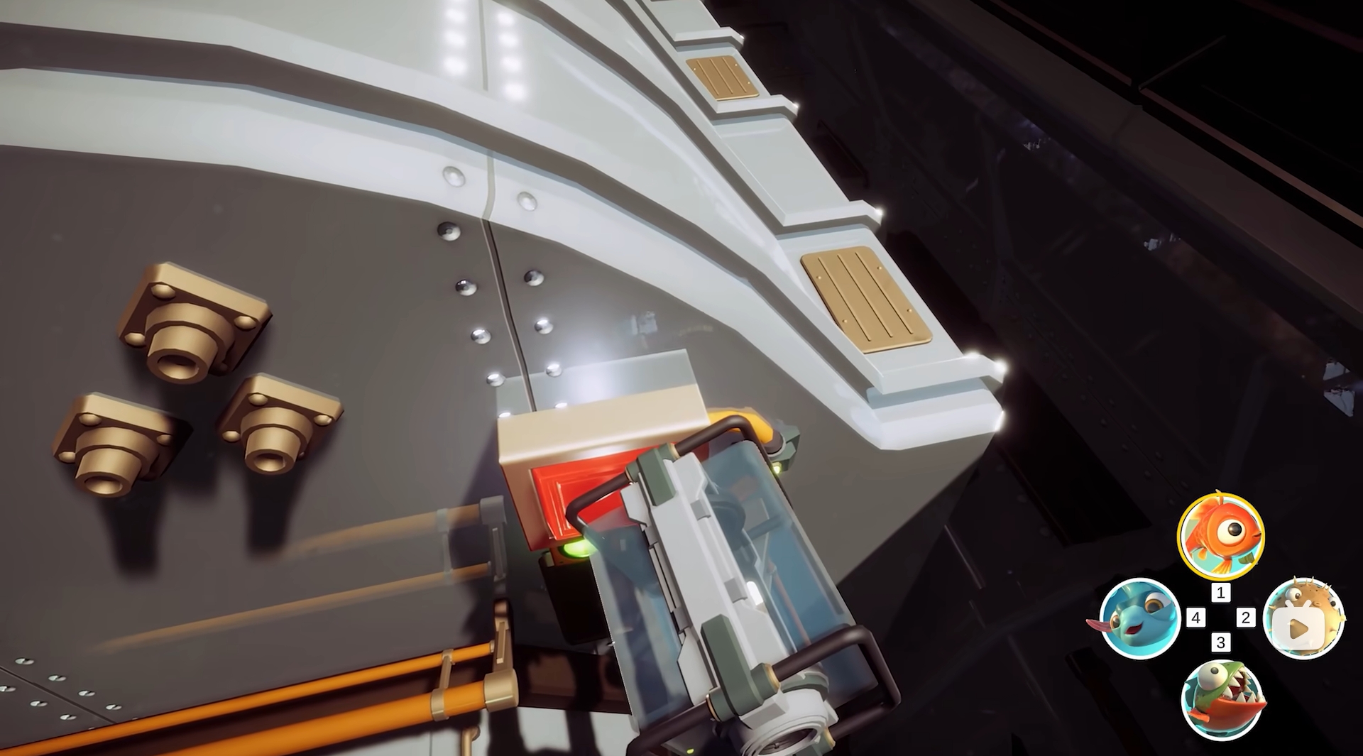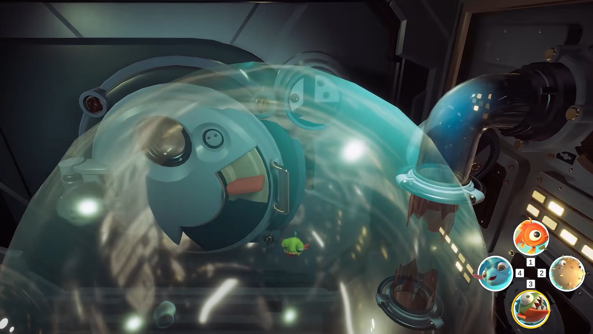 失重舱只有少部分地方存在漂浮着的水球,若是在移动时离开水球太久就会死亡,需格外注意。来到失重舱后,继续控制食人鱼朝下方小鲤鱼所在的水球处移动,咬开限制机关,然后转为控制小鲤鱼。小鲤鱼会与自己的水箱一起移动,不用担心缺水问题,玩家可让它朝着失重舱的尽头走,并利用水箱撞开沿途的水管,让更多的水球能充满整个失重舱,方便其它小鱼进行移动,完成后切换成食人鱼,过来拉开失重舱门的开关,然后再换成小鲤鱼去新区域探路,沿途撞破水管,待来到尽头后让所有小鱼都过来,接着切换成河豚穿过前往的小通道来到新区域,并让小鱼儿们在新存档点完成集合。