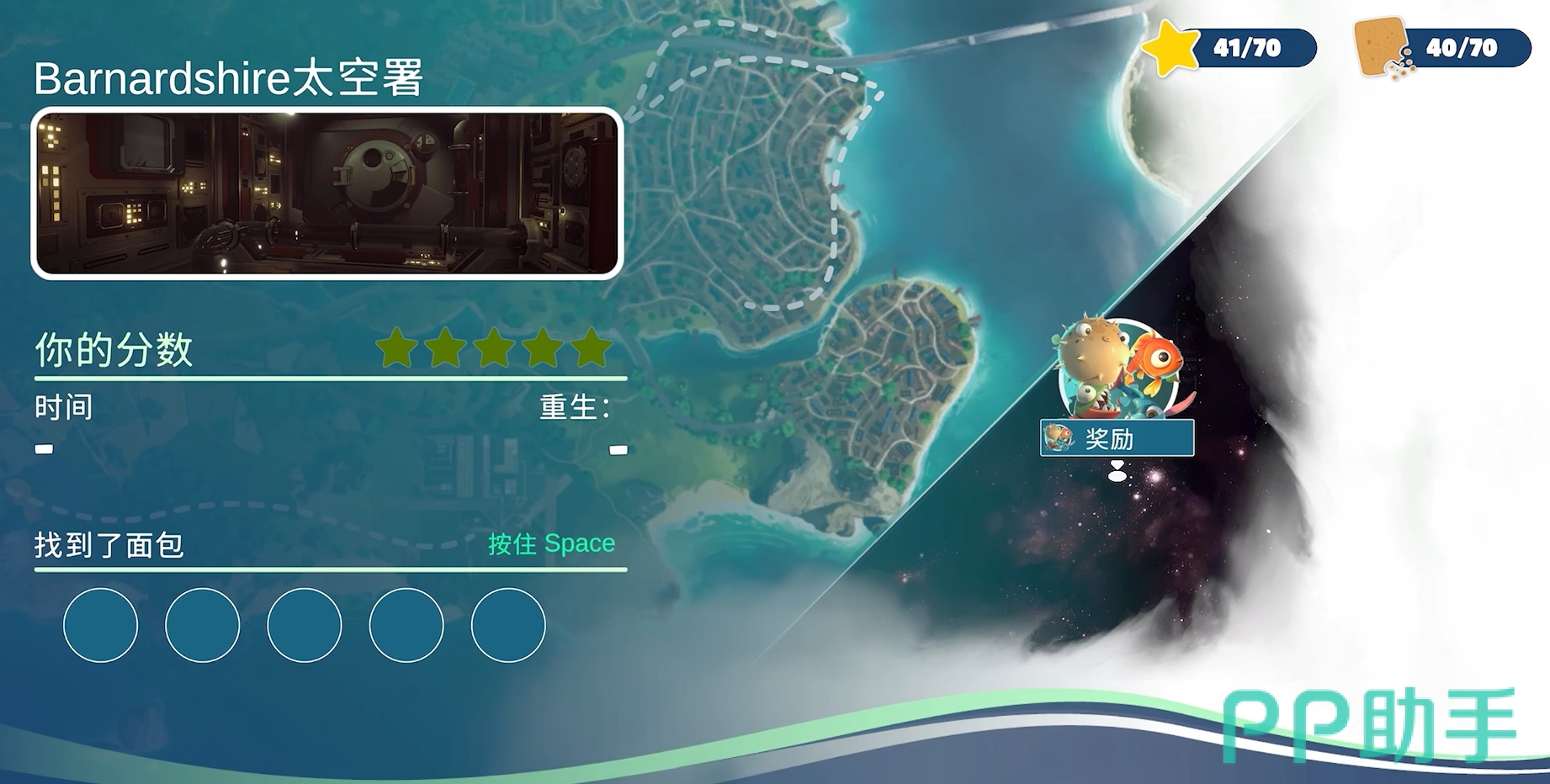 当玩家们将所有的主线都完成后,同时还要满足星星的数量和所收集的面包数量都达到40,就能将隐藏关卡给解锁。该隐藏关卡名为太空署,可控制4条不同的小鱼。开启关卡后,各位可先切换到河豚,用它顶起身边红色的开关救出食人鱼,然后立刻切换到食人鱼身上,操控它来到河豚区域,拉开另一边的机关并沿着新通道前进,被拦路时继续咬机关打开通道,直至看到存档点。完成存档后各位可继续让食人鱼拉开旁边的机关,即可前往小鲤鱼所在失重舱。