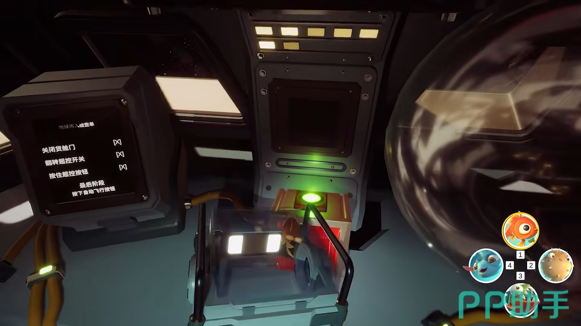 该区域为最终区域,人们需控制小鲤鱼通过上方的通道来到飞船外分别按下外边的两个开关,然后回去来到驾驶台的红色按钮前。切换成河豚移动至驾驶台上方水球里,膨胀顶住上方的开关。再切换成河豚,从驾驶台左下方的通道进入,打开通道尽头的开关,接着切成蓝鱼,让它来到上方通道旁的按钮出点一下,即可达成启动飞船的所有前置条件。此时只需让小鲤鱼按下驾驶台的红色按钮,就能启动飞船返回地球并通关。