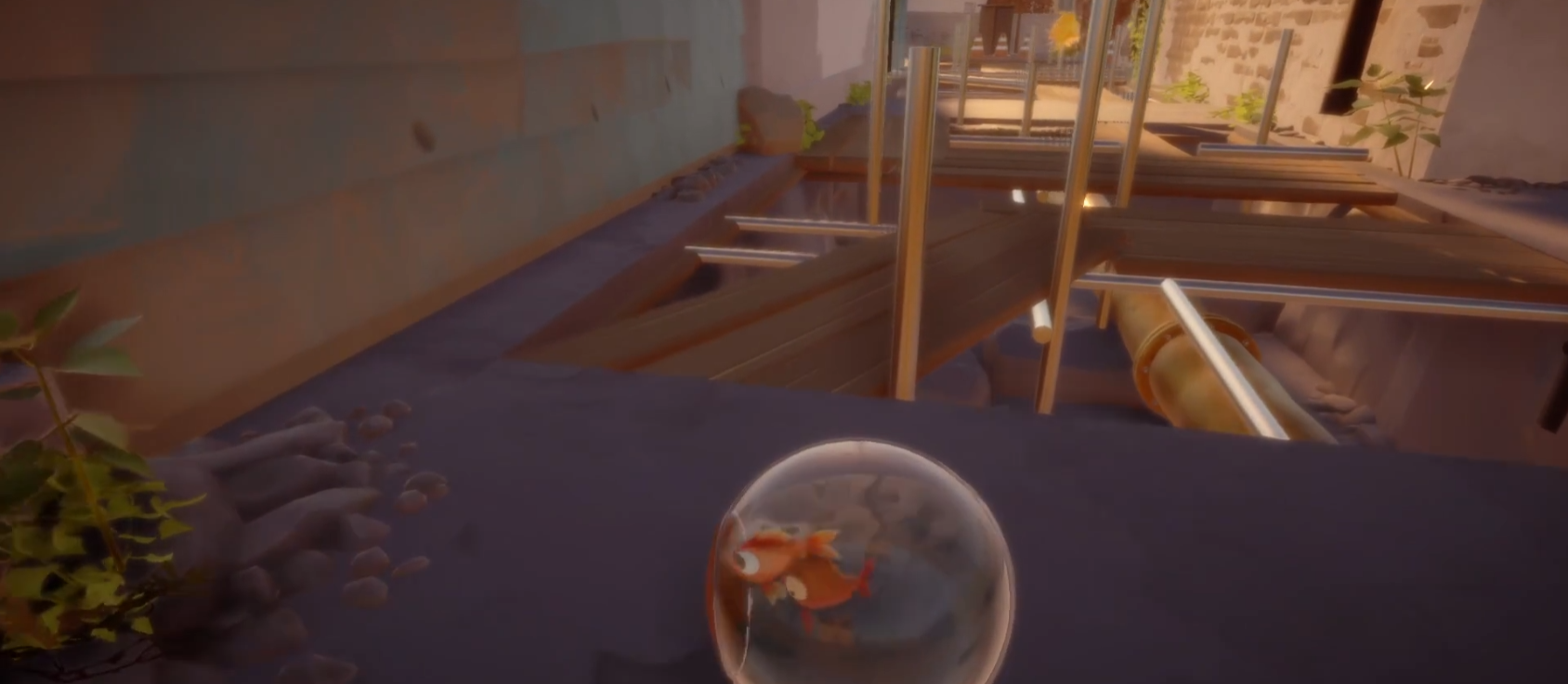 金鱼的第二关场景设定在阁楼,沿着阁楼上可行动的轨迹前行,寻找有缓冲物的位置下落,地面上若有鱼食,可操控金鱼吃掉,随后利用推力将梯子推下去,形成通往阁楼外的路径,到达阁楼外后往回走一些,贴着墙边缓慢往下移动,此时要格外注意由于球体鱼缸存在惯性,速度过快易跌下去,尽量等待球体稳定后再继续向下,跌落地面后金鱼会随着碎裂的鱼缸掉入泳池,进而进入地下水空间,在地下水管道中会遇到栅栏,玩家需通过按键操作让金鱼跳跃通过。