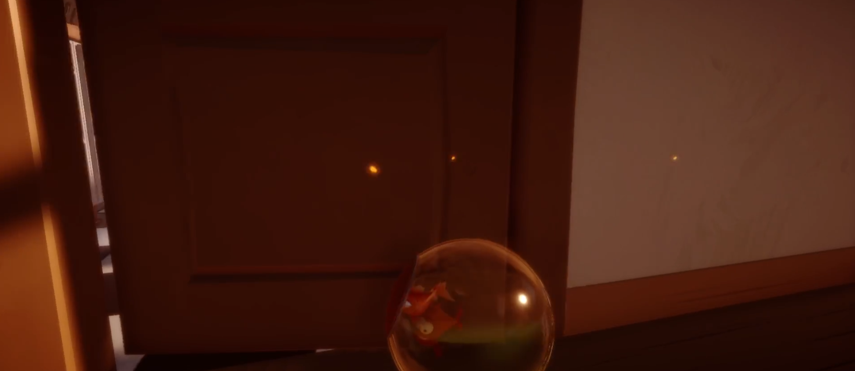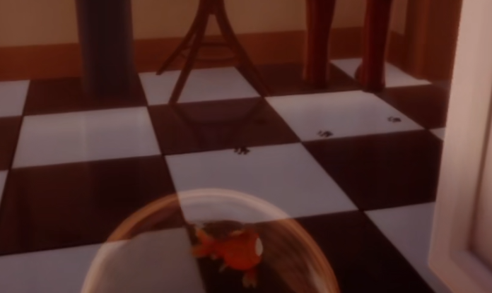 在进入屋里的时候,我们会触发一段剧情,等待剧情过完,我们会进入一个鱼缸,而这时候我们也就可以自由移动了。进入鱼缸之后我们顺着楼梯往一楼下,在二楼的最前方我们会发现一片面包,小伙伴们注意一定要拿了面包再下二楼!下到一楼之后,我们会发现一个虚掩着的门,里头会传来钢琴声,我们进去即可。