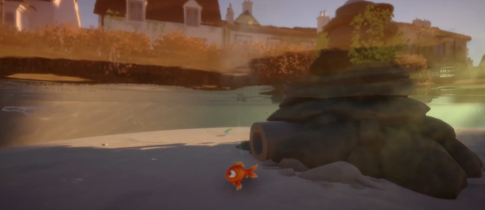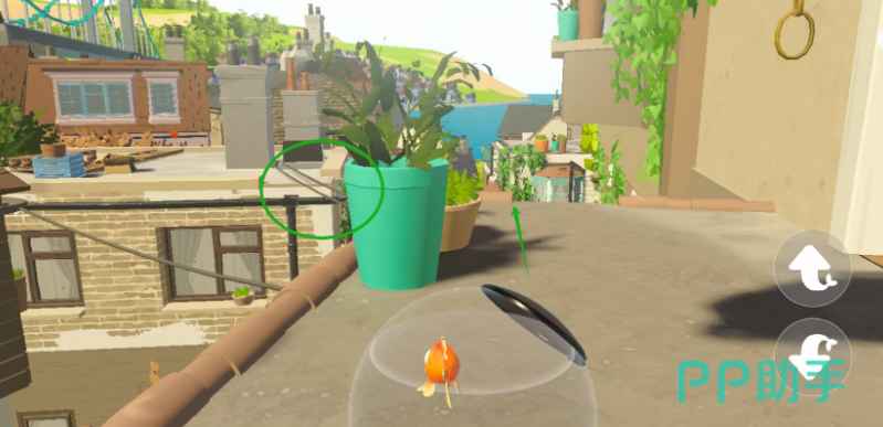 在游戏的一开始,我们会作为一条金鱼,进入到一片水塘里面,在这个池塘里面会有一个面包片,我们需要往相反的方向过去先拿到面包片,才能继续前进。拿到面包片之后,我们朝着别墅的方向游动,然后会发现一个石碓,凑齐看会看见石碓的左下方有一个洞口,我们从这个洞口进入,之后水压便会将我们给弹射到房子上方的水管里面,我们向右边游泳前进。