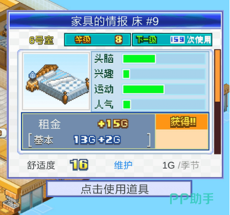 9点左右房客就会看房,这样就不用等很长时间。可以把房间里面的所有设施全部拆了,重新进行设置。前期的时候因为经济并不是很充足,再加上自己没有那么多设施,所以比较好布置。如果前期的时候觉得舒适度并不是很充足,在经济能力比较充足的情况之下,可以再放上一张床。前期的时候没有必要设置太多的专用房间,这样很浪费资金。